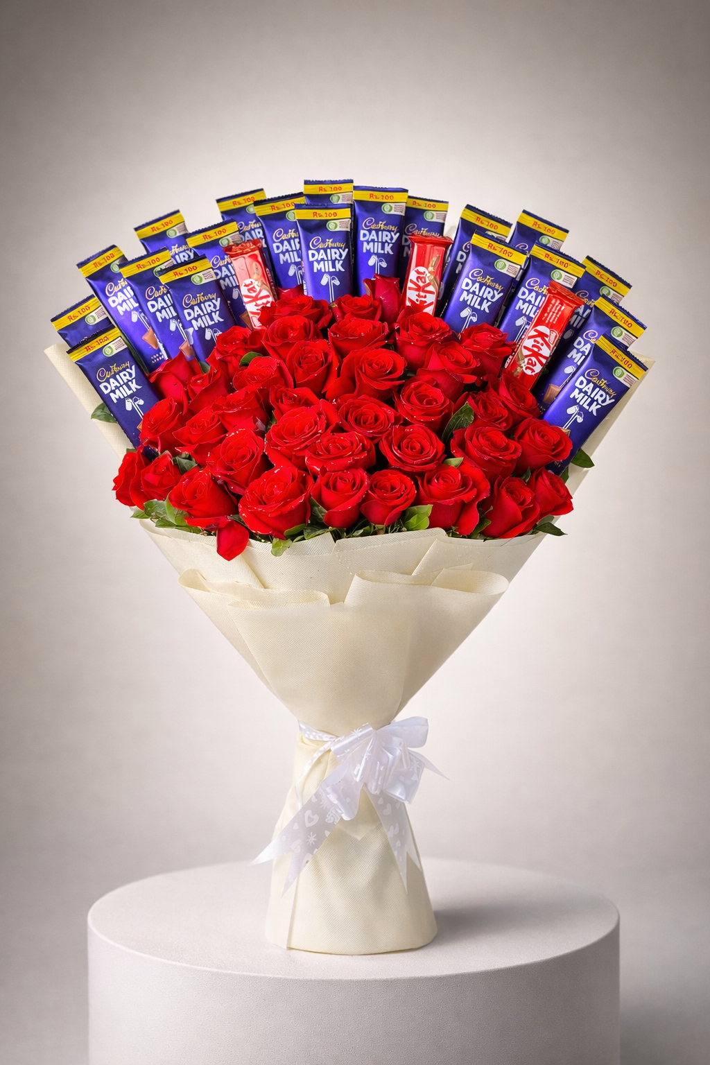 Experience the ultimate indulgence with an arrangement that speaks to both the heart and the palate. This luxurious ensemble features a dense core of premium, hand-plucked red roses, symbolizing passionate devotion. Surrounding this floral center is a fan of iconic Cadbury Dairy Milk and KitKat bars, meticulously positioned to create a grand, multi-sensory display. The arrangement is showcased in a soft, cream-toned artisan wrap and finished with a pristine white satin bow. Whether you are celebrating a significant birthday or planning a grand Valentine’s surprise, this decadent fusion of sweetness and romance is designed to leave a lasting impression. Every stem and sweet is selected for quality and visual perfection, ensuring a high-fashion gift that stands out from traditional bouquets.